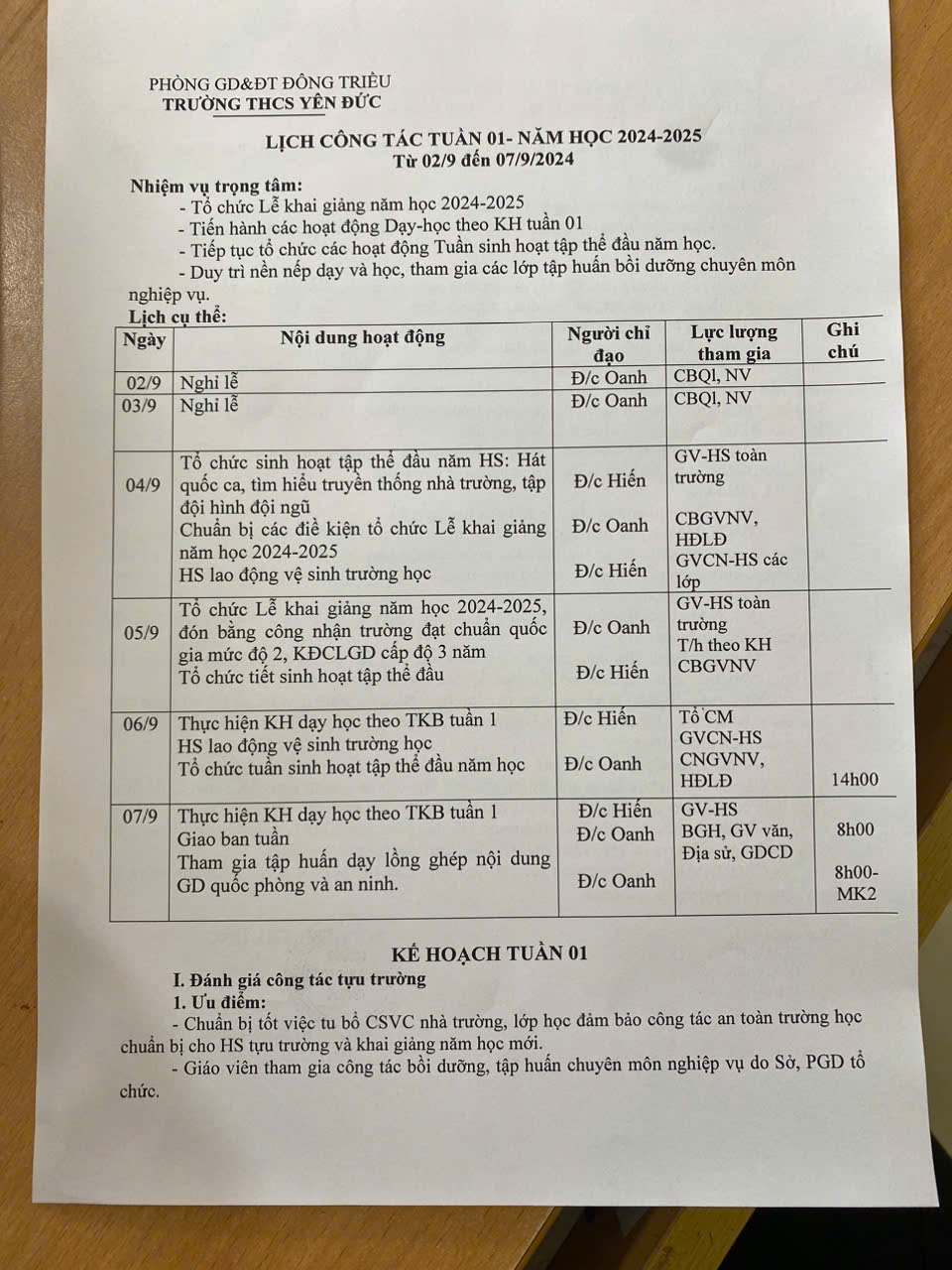 Lịch công tác tuần năm học 2024-2025